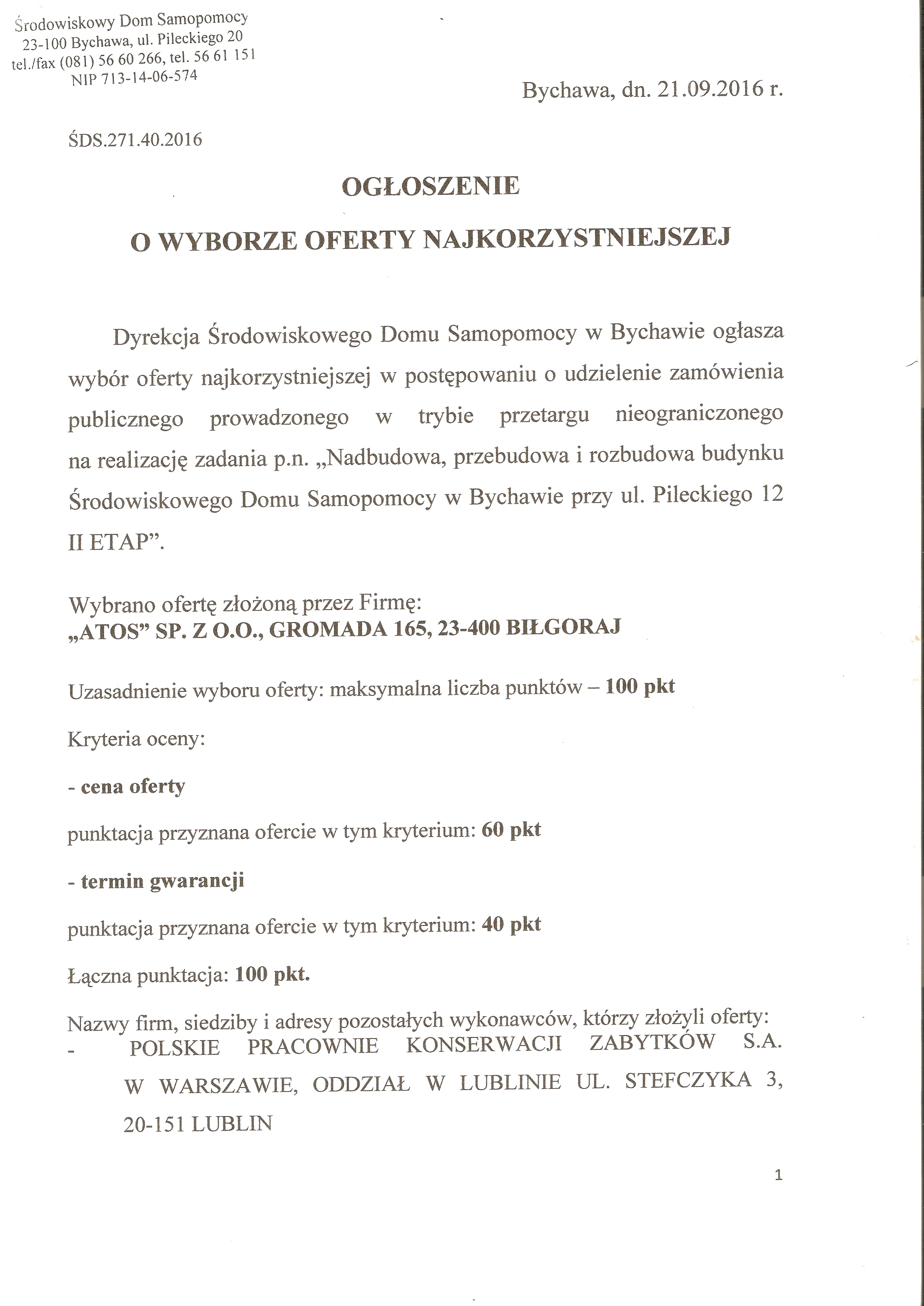 powrót do listy przetargówNadbudowa, przebudowa i rozbudowa budynku Środowiskowego Domu Samopomocy w Bychawie II etap
